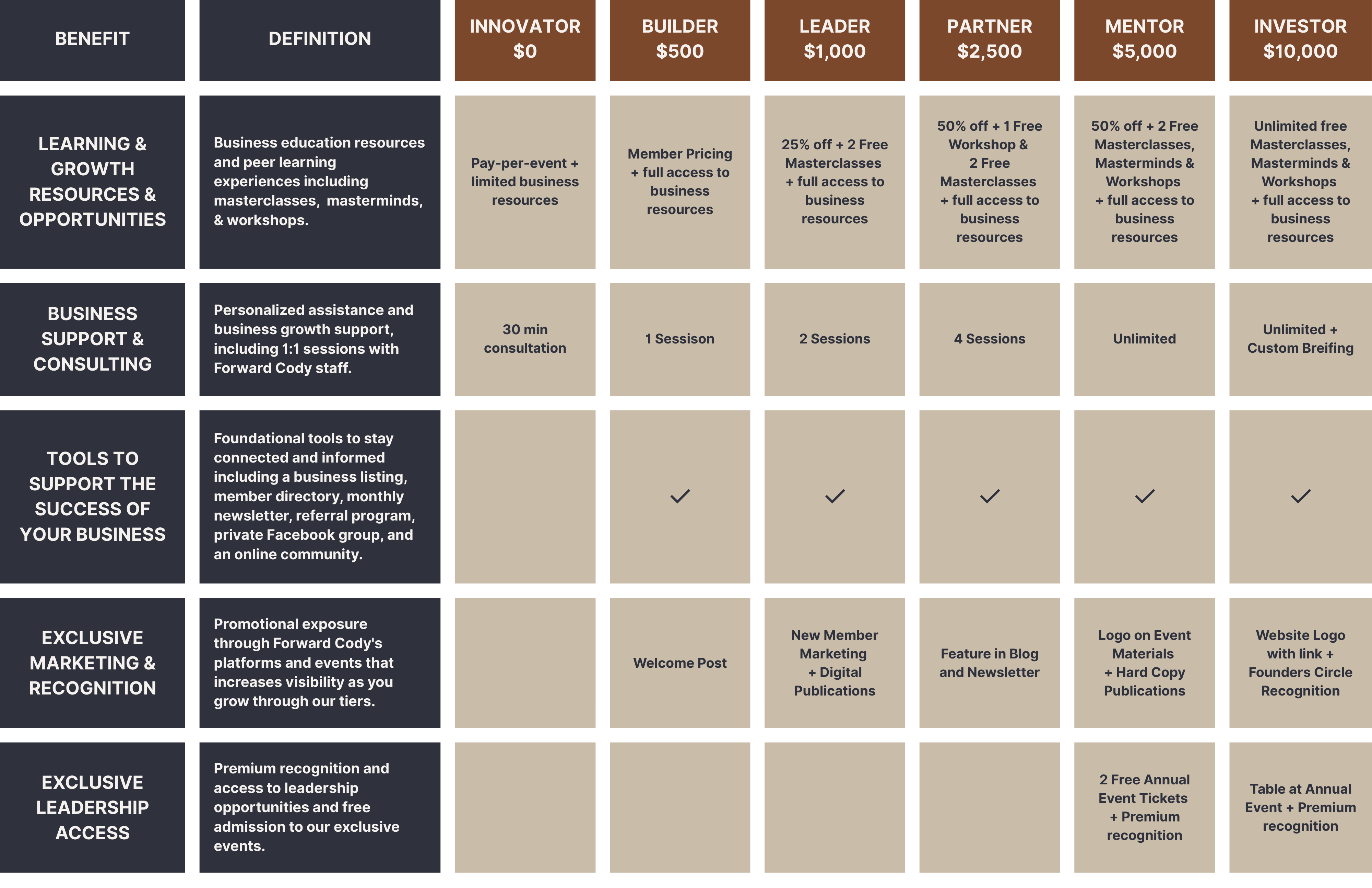 Forward Cody’s updated membership experience is designed to be simpler, more valuable, and more connected to your business goals. Once you join or renew your membership, you’ll be guided through a streamlined membership dashboard where you can: